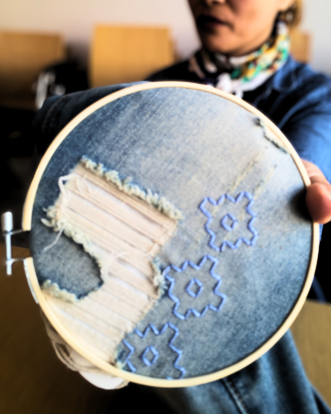 Questa tecnica, che utilizza scarti di stoffa e fili colorati permette di prolungare la vita di vecchie T-Shirt o felpe, un azione che contrasta il fast fashion e promuove la manualità.